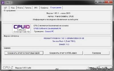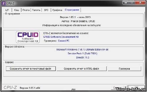 | CPU-Z способен показать различную информацию о вашем процессоре, такую как название и производитель, частота, техпроцесс изготовления, коэффициент умножения частоты, частично определяется "разогнанность" процессора... Кроме того, информация о кэшах первого и второго уровня, поддерживаемых наборах команд и прочее... Иногда процессоры с одним и тем же наименованием скрывают неодинаковую «начинку» – различные ядра с разными степпингами, возможностями, разными частотами при одинаковом рейтинге, произведенные по разным техпроцессам и т. д. Часть этих данных можно было бы получить, изучив надписи на крышке процессора, но они, как правило, надежно скрыты в системном блоке под кулером и слоем термопасты. Поэтому значительно более удобным способом получения подобной информации будет применение утилиты CPU-Z. Возможности: Точно определяет основные характеристики процессора: наименование, тип ядра и степпинг, используемый разъем, поддержку тех или иных мультимедийных инструкций, объем и параметры кэш-памяти Предоставляет данные о текущих режимах работы: частоты процессора и шины, множитель, питающее напряжение Предоставляет информацию об объеме и текущем режиме работы ОЗУ, содержимом SPD-блоков модулей памяти. Дополнительно – базовые сведения о материнской плате и отдельный бенчмарк латентности памяти. Новое в CPU-Z: AMD A6-6420K, A4-6320, A4-4020. AMD Athlon 5350 & 5150, Sempron 3850 & 2650 Kabini. Intel Core i7-4770R and Core i5-4570R Crystal Well. Added graphic card vendor. Особенности версии: русифицированные портативные программы 32-bit и 64-bit работают без установки Версия программы: 1.69.0 Последняя Версия программы: 1.69.0 Адрес официального сайта: CPUID Автор русской локализации: Loginvovchyk Операционная система: Windows XP/Vista/7/8 Язык интерфейса: Русский Лечение: не требуется Тип файла: .rar Размер: 7,70 Мб Скачать CPU-Z 1.69.0 Portable by loginvovchyk